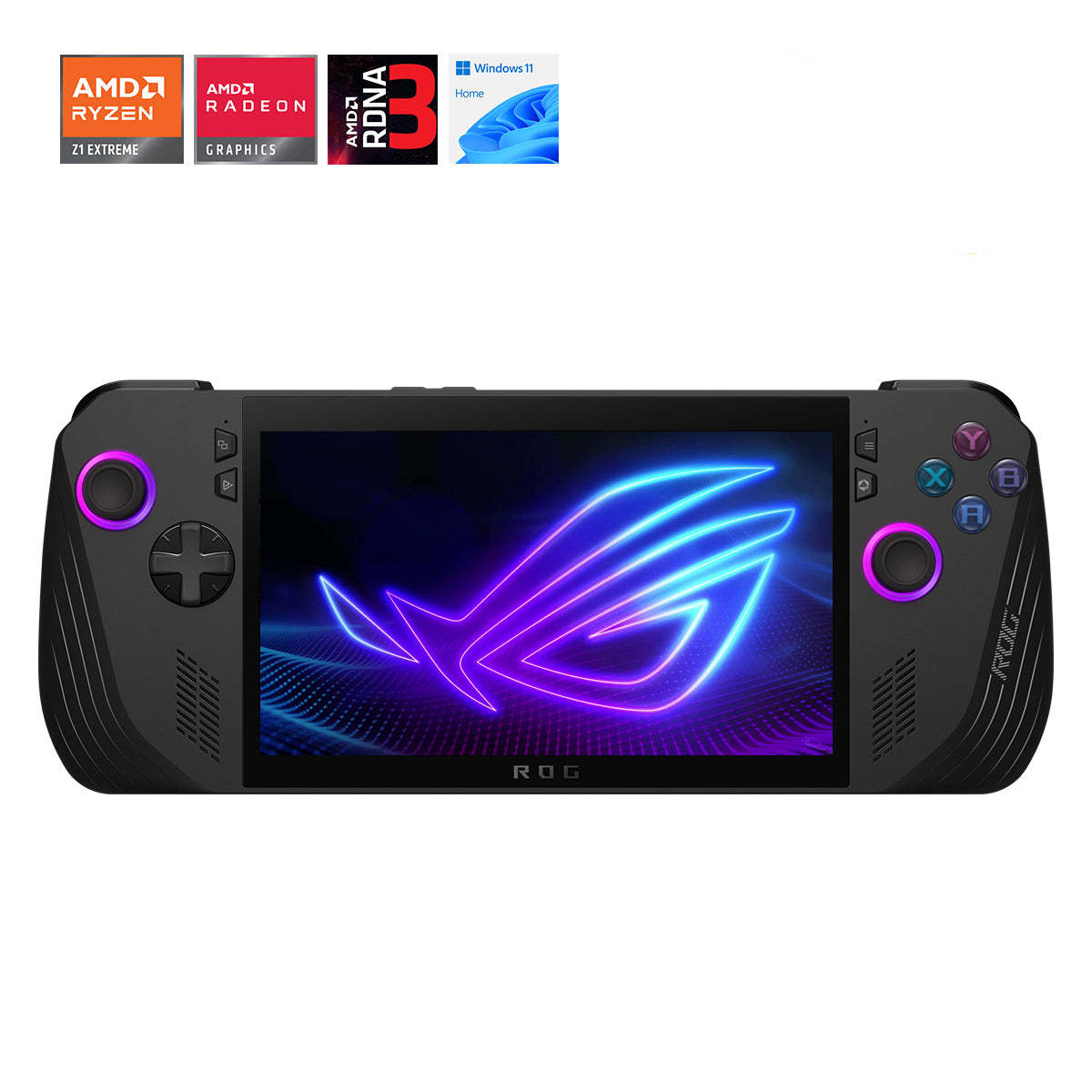 | Control and Input | A B X Y buttons D-pad L & R Hall Effect analog triggers L & R bumpers View button Menu button Command Center button Armoury Crate button 2 x assignable grip buttons Thumbsticks: 2 x full-size analog sticks Haptics: HD haptics Gyro: 6-Axis IMU |