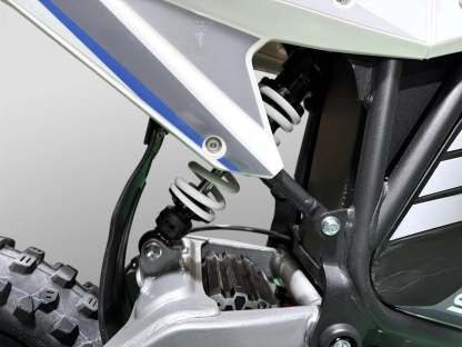 The reinforced rear swingarm improves stability and rear-wheel tracking, giving the bike a more planted feel through corners, acceleration zones, and rough sections.